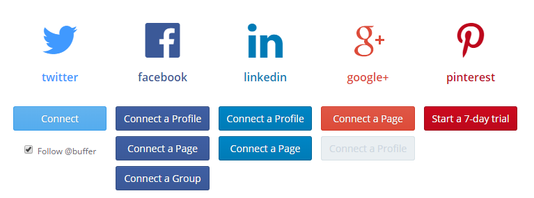 In der kostenfreien Buffer Version könnt Ihr für jedes soziale Netzwerk ein Profil anschließen. Also könnt Ihr aktuell einen Twitter Account, ein Facebook Profil (oder Seite oder eine Gruppe, die ihr verwaltet), ein LinkedIn Profil (oder Seite) und eine Google+ Seite mit dem Tool verbinden. Pinterest ist seit kurzem auch dabei, ist aber ausschließlich in der Bezahlversion enthalten.