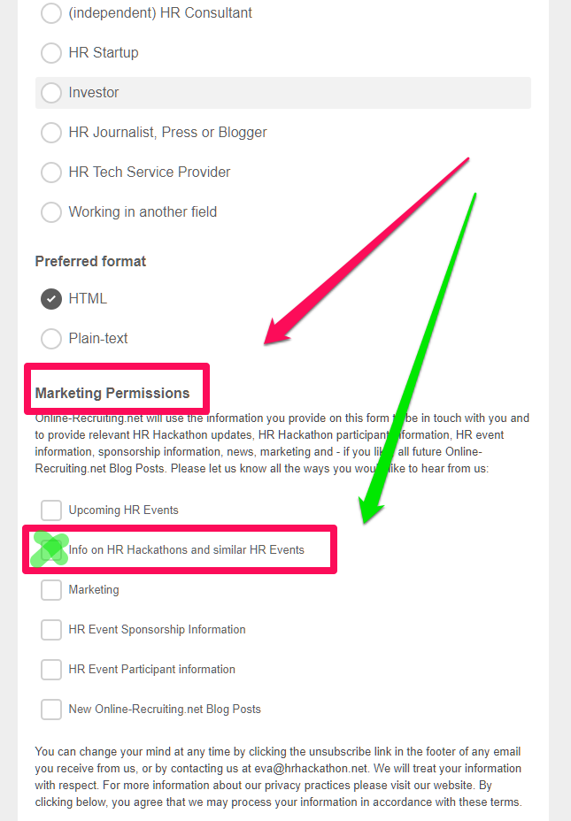 Wenn Ihr Euch einen der 50 Live Sitze sichern wollt, meldet Euch bei meinem Newsletter an und wählt unten bei den “Marketing Permissions” mindestens die OptionInfo on HR Hackathons and similar HR Events” aus.