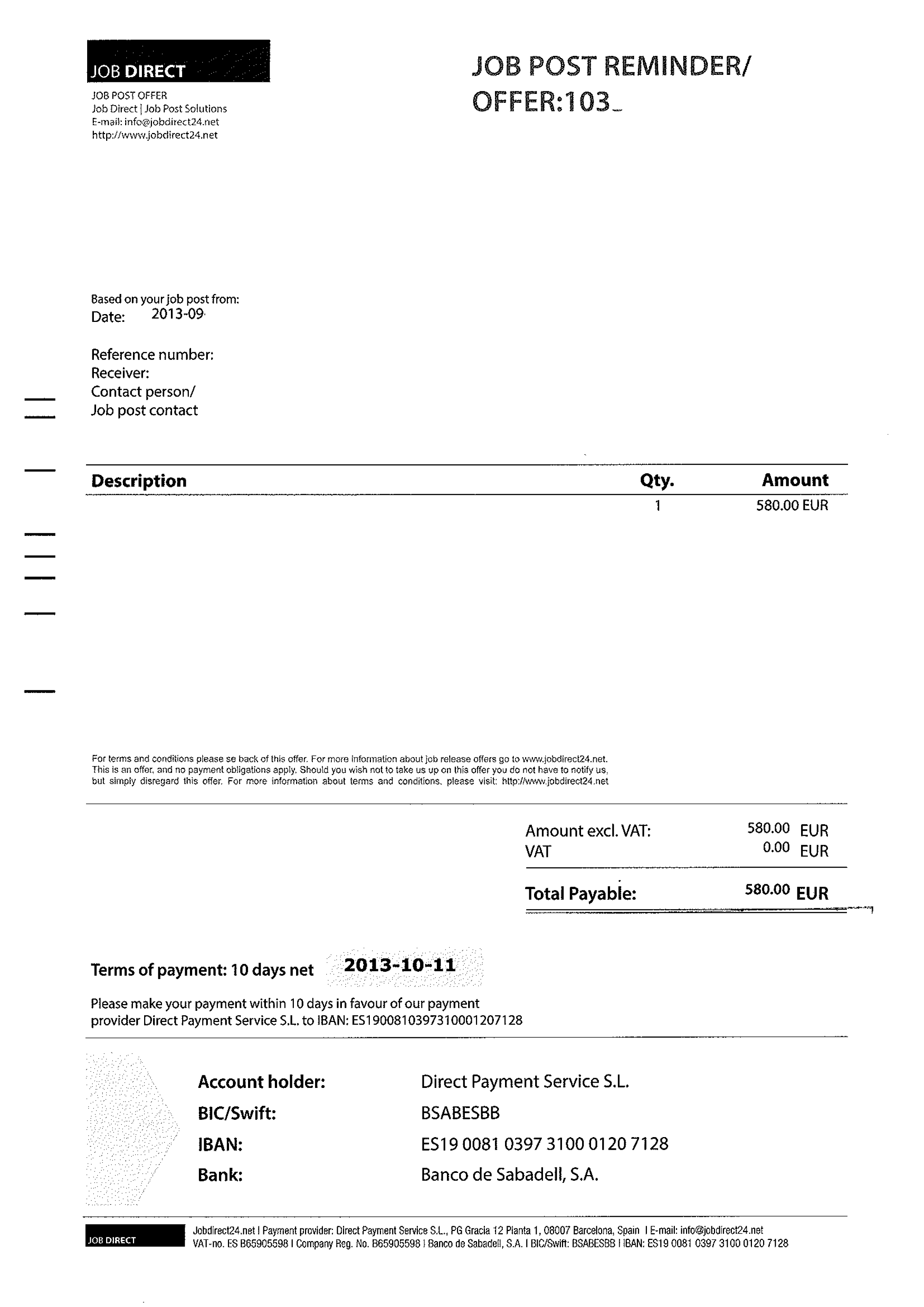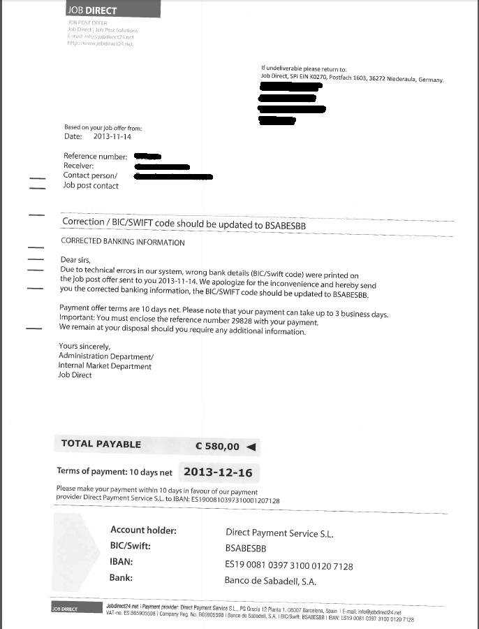 Dieses Mal geht das “Unternehmen” JobDirect24 ein wenig anders vor, und man bemerke ebenfalls eine (Briefkasten-) Adresse am oberen rechten Seitenrand: Es ist zwar im Text nach wie vor einem “Job Post Offer” die Rede – also nach wie vor handelt es sich um ein Angebot – aber es wird ein neuer, korrigierter IBAN-Code angegeben. Letzterer unterscheidet sich jedoch gar nicht von dem in der Vorgänger-Rechnung.