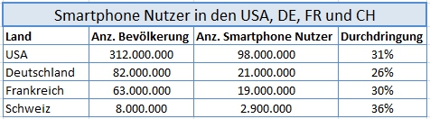 Die Entwicklung der Smartphone Nutzerzahlen nimmt in unseren Breiten im Vergleich zu den USA enorm zu. In Deutschland, Frankreich, der Schweiz und den USA sehen die aktuellen Zahlen folgendermaßen aus (in Relation gesetzt mit den tatsächlichen und aktuellen Bevölkerungszahlen in den jeweiligen Ländern):