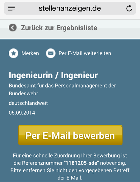 responsive-webdesign_stellenanzeigen-deMindestens ein Verbesserungspunkt bleibt: Zwar ist in den Anzeigen selbst ein prominenter “Bewerbung-Button”, ABER (!) Jobsuchende können sich nur per E-Mail bewerben.