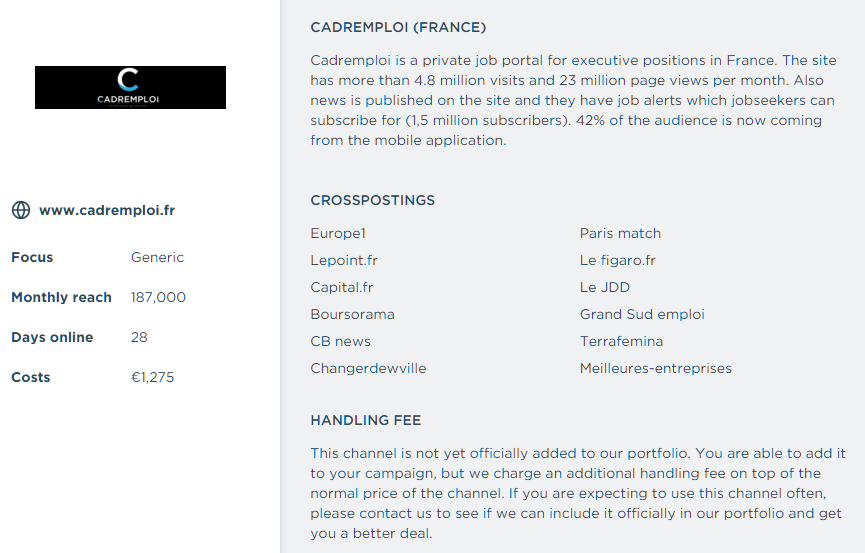 So sieht z.B. das Datenblatt für cadremploi bei Jobboardfinder folgendermaßen aus: