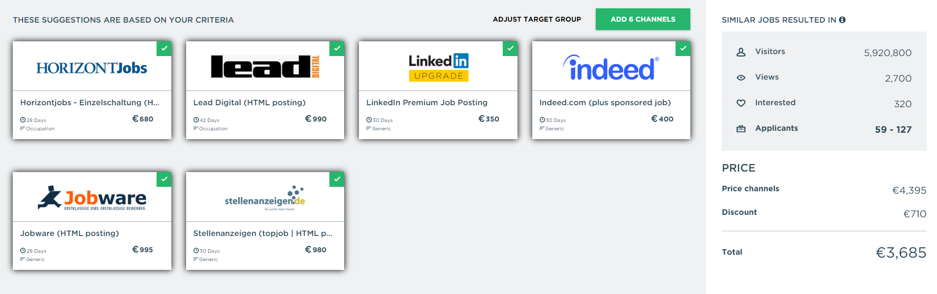 Haben Recruiter ihre Auswahl getroffen, berechnet der Algorithmus (anhand von ausgewähltem Land oder dem Job Level, Bildungsabschluss, Relevanz und Performance – z.B. Qualität der Bewerbungen, wenn genügend Daten vorhanden, oder Anzahl der Bewerbungseingänge) den idealen Medienmix. Dabei gibt es jeweils eine Mischung aus Generalisten und Spezialisten Stellenmärkten, je nachdem, welche Kombination sich als am effektivsten erwiesen hat.